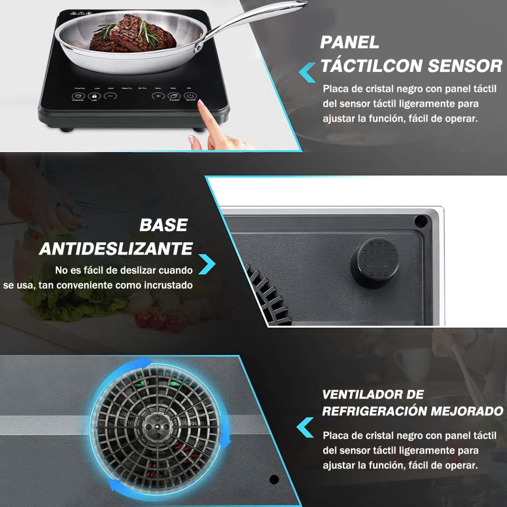 VERSÁTIL DE USAR : La estufa de inducción es adecuada para cocinar casi cualquier plato sin abrumar sus circuitos. 200W a 1000W. Los 8 modos de cocción actuales incluyen sopa, leche, vapor, freír, salteado, olla caliente, agua, mantener caliente. Además, panel de control táctil LED fácil de usar con sistema de bloqueo de seguridad para niños y temporizador digital incorporado de hasta 24h.