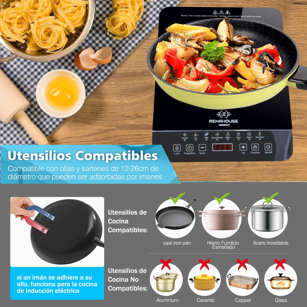 QUEMADOR DE INDUCCIÓN COMPACTO Y PORTÁTIL: El quemador de inducción portátil y liviano facilita el manejo y el almacenamiento. El quemador de inducción portátil se puede almacenar de lado y es perfecto para dormitorios, cocinas domésticas, cocina en el patio trasero, vehículos recreativos, botes, etc. El diseño compacto utiliza un tomacorriente de 110 V, estándar en todas las casas de Colombia.