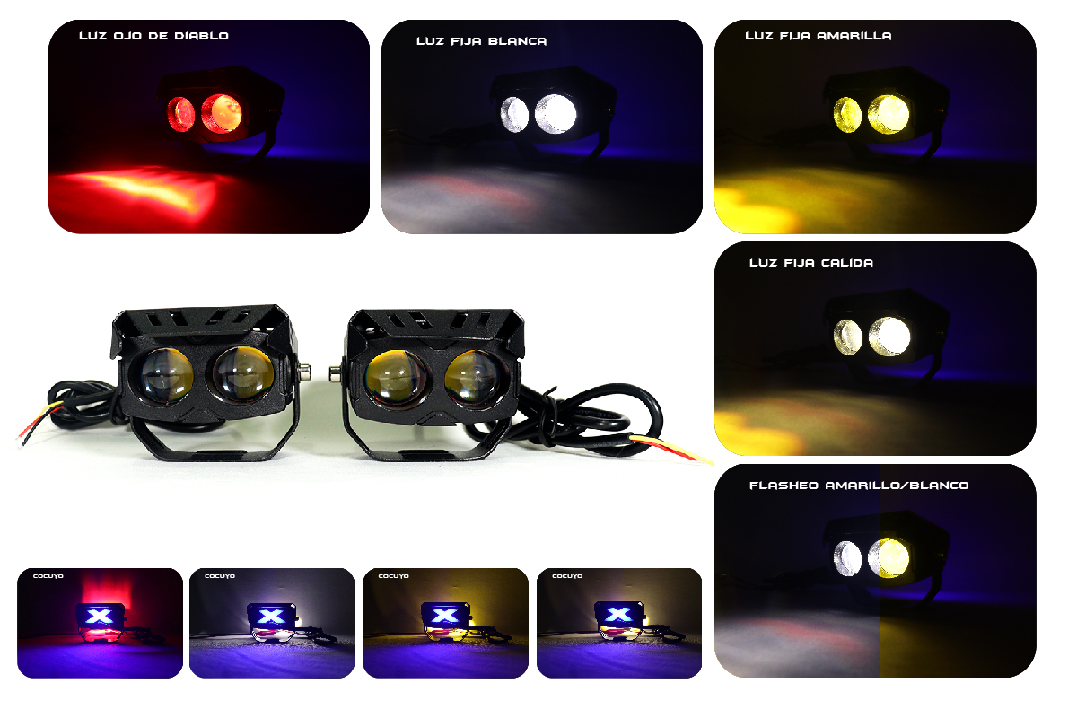 - Funciones: cinco 1: Luz alta: blanca 2: Haz bajo: amarillo 3: Luz alta + haz bajo brillante al mismo tiempo: blanco + amarillo 4: luces de circulación diurna: azul 5: modo estroboscópico: blanco + estroboscópico amarillo