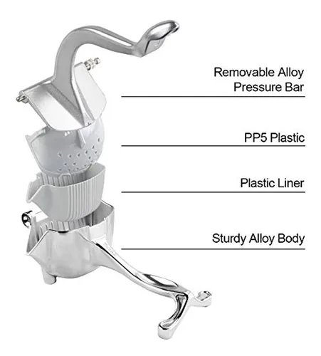 - Mango ergonómico, cuerpo de aleación resistente que hace que tus manos nunca se queden sin esfuerzo, el diseño del pie inferior hace que el exprimidor se pueda colocar fácilmente y de forma estable en la mesa, no se resbale fácilmente.