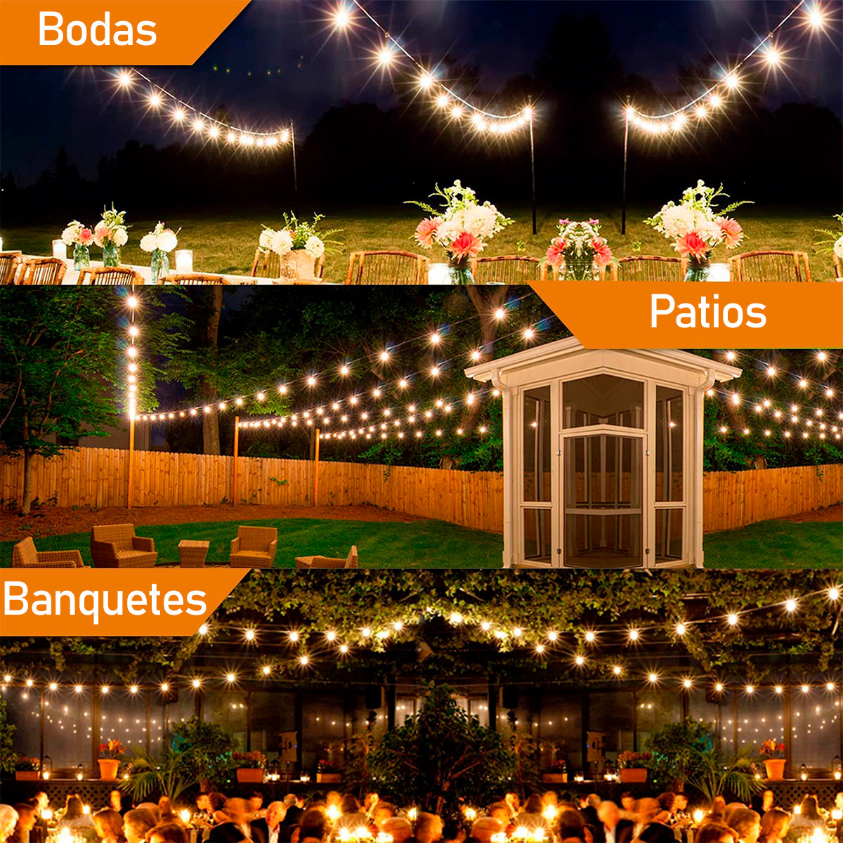 - Las luces de bombillo son aptas tanto para uso en interiores como al aire libre.