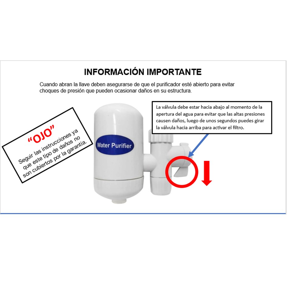 ATENCIÓN: El producto puede sufrir daños cuando recibe choques de presión de agua muy altas, por favor prestar atención a las instrucciones contenida en el empaque para evitar daños.