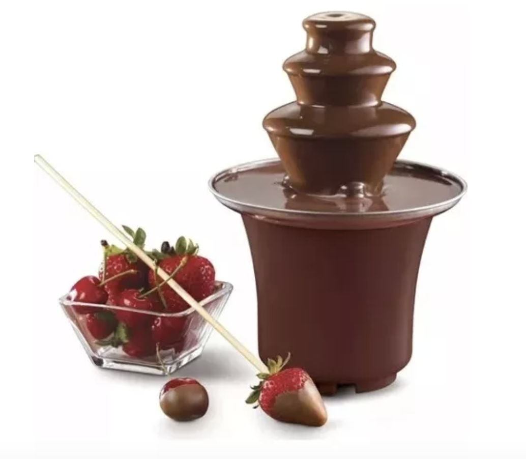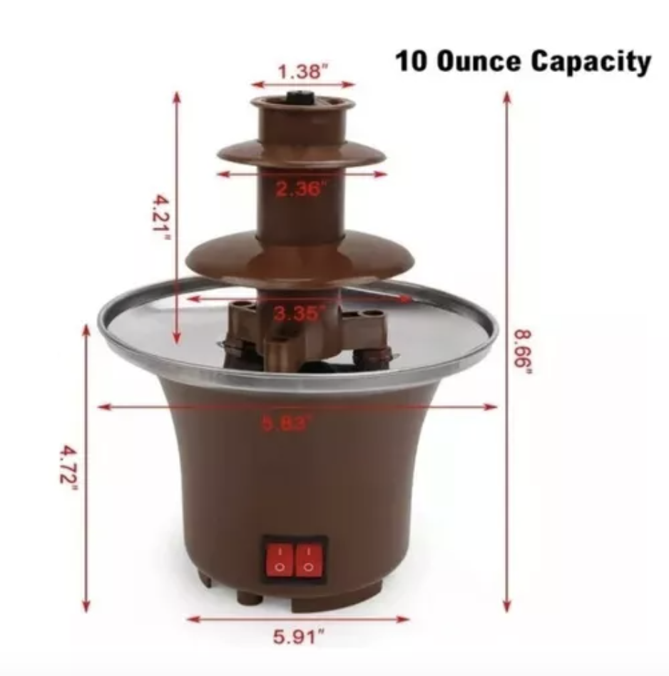 Especial para cubrir con chocolate varios tipos de frutas y cascadas extra suaves. Para disfrutar por largo tiempo del chocolate, este debe estar caliente, ya que se transporta por medio de un eje caliente hasta la parte superior de la fuente, para luego caer continuamente en suaves cascadas, posee pies con altura ajustable para un fluido balanceado y perfecto del chocolate. Contiene cabina y torre de acero inoxidable, además una bandeja de goteo de acero inoxidable, uso continuo 40 min 1 interruptor, estabilidad excelente a través de pies encauchados, energía 120 v 60 hz 180 w.
