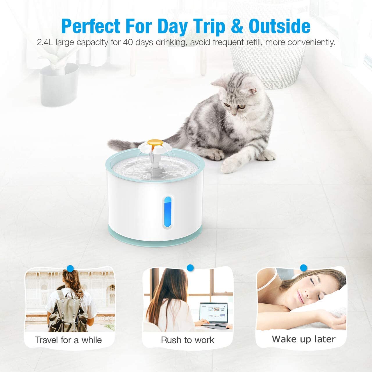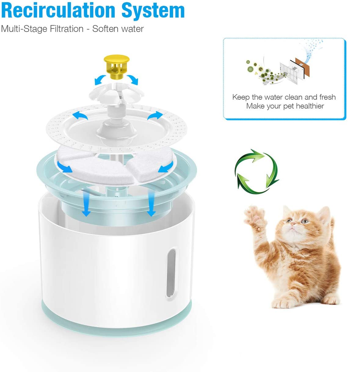 Agua en movimiento: El agua que fluye es la elección natural de las mascotas. Para los animales, el agua que fluye es «vida» y es un signo de fuentes de agua limpias y fiables. El agua potable insuficiente o sucia a largo plazo para los animales puede afectar seriamente la salud de los riñones y urinarios.
