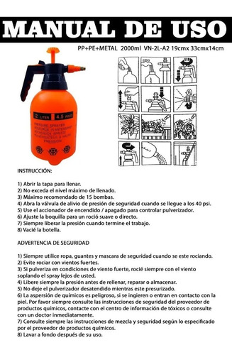 Para garantizar la seguridad, recuerda siempre utilizar ropa, guantes y una máscara de seguridad adecuada cuando estés rociando con este pulverizador. Evita rociar en condiciones de viento fuerte y libera la presión antes de rellenar, hacer reparaciones o almacenar el pulverizador. Además, ten en cuenta que la aspersión de productos químicos puede ser peligrosa, por lo que es esencial seguir las instrucciones de seguridad del proveedor de productos químicos y consultar a un médico en caso de contacto con la piel o ingestión.