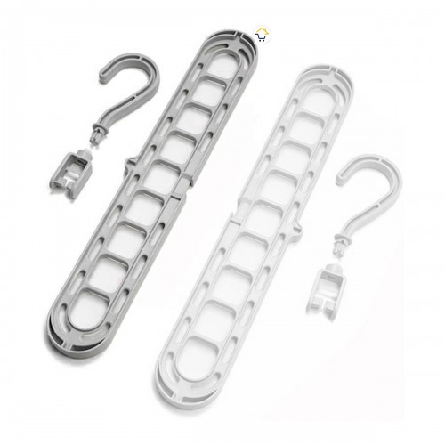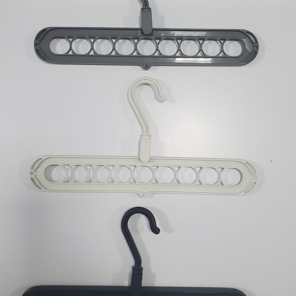gancho ahorrador de espacio perfecto para optimizar interiores de roperos y closet, se usa de forma horizontal o vertical, este cuenta con 9 orificios en donde se puede colgar 9 prendas; el producto cuenta con un modo de uso demasiado sencillo para cualquier tipo de usuario además cuenta con tres colores disponibles y esta elaborado en polipropileno reforzado y pesa 65 gramos