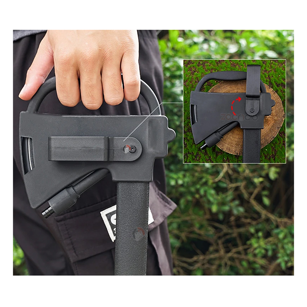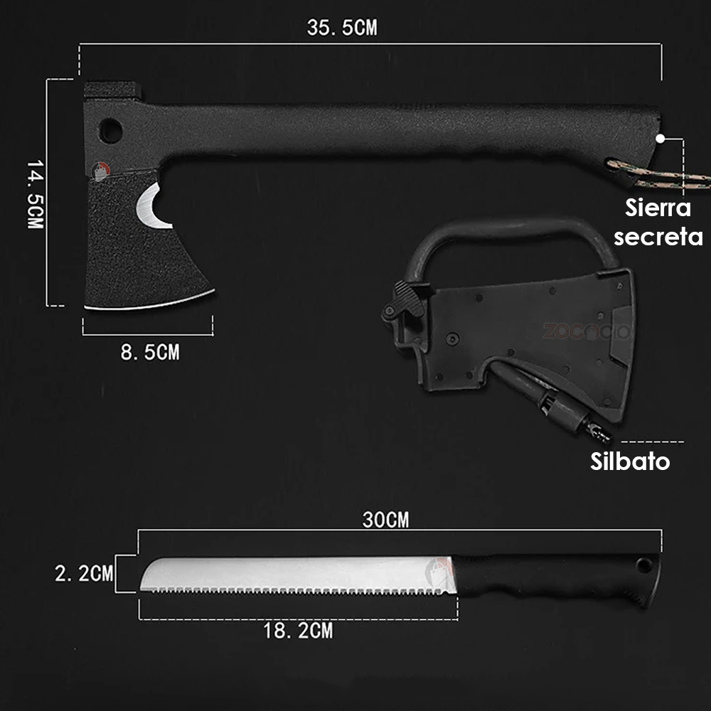 Hacha multipropósito con diferentes accesorios con los que podrás sobrevivir en un camping, o para un día de caza. Trae un soporte para transportarla fácilmente, silbato, pedernal, cuchillo de sierra.