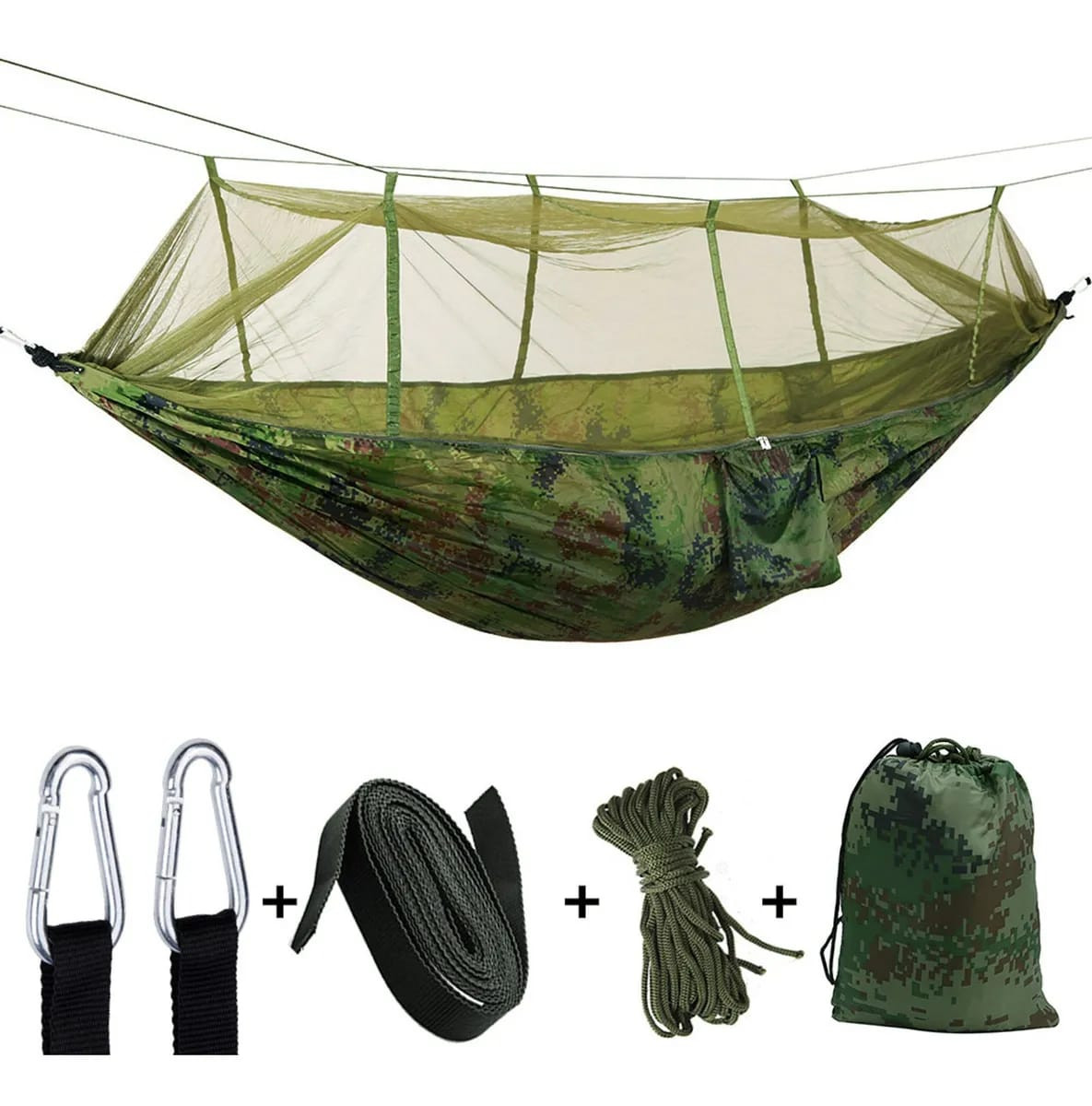 1 * hamaca, 2 * hebilla, 2 * amarre, 1 * cuerda de mosquitera, 1 * bolsa