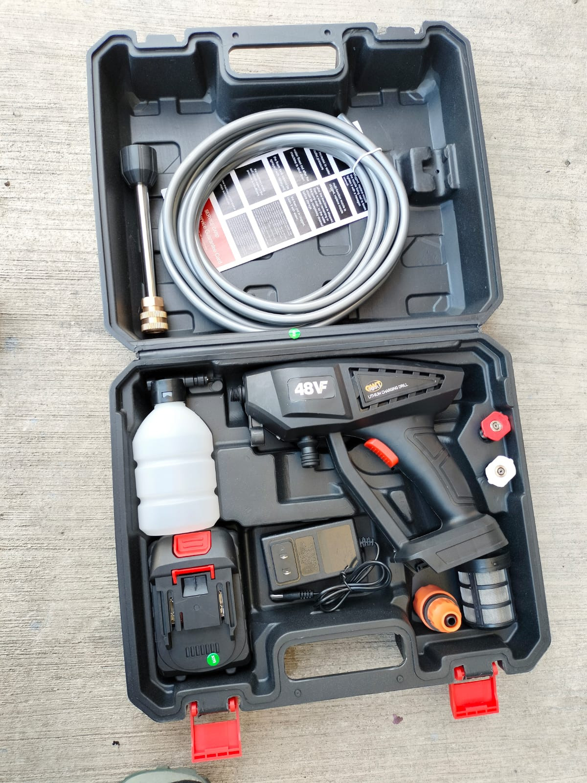 Viene con boquilla de 0° y 40°, con recipiente de riego de espuma para limpiar profundamente los automóviles.