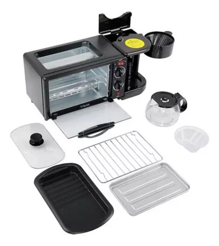 Esta máquina eléctrica combina las tres funciones de un horno tostador, una máquina de café y una bandeja para hornear, lo que le permite cocinar café, asar salchichas, huevos fritos, etc. mientras prepara el desayuno en la mañana, ahorrando tiempo.