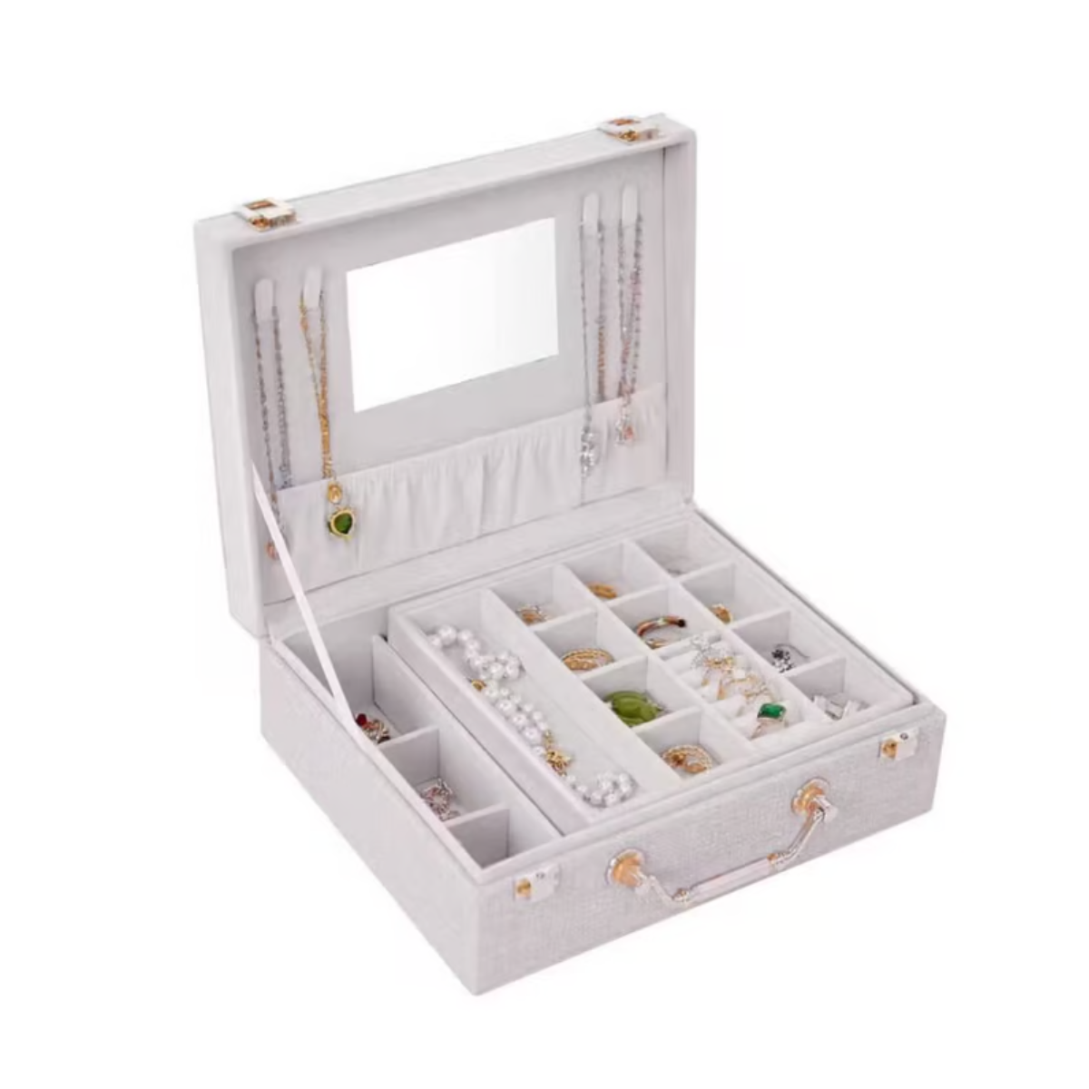 En el extremo izquierdo del joyero tiene 2 cuadrados grandes, que se pueden utilizar para almacenar broches grandes, anillos grandes, etc., y varias particiones funcionales para facilitar su almacenamiento.