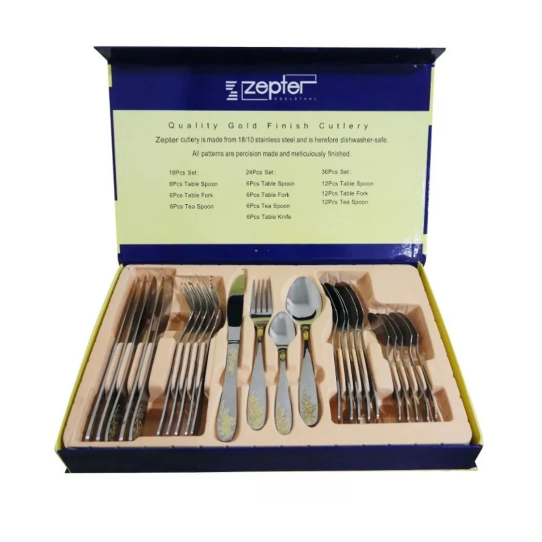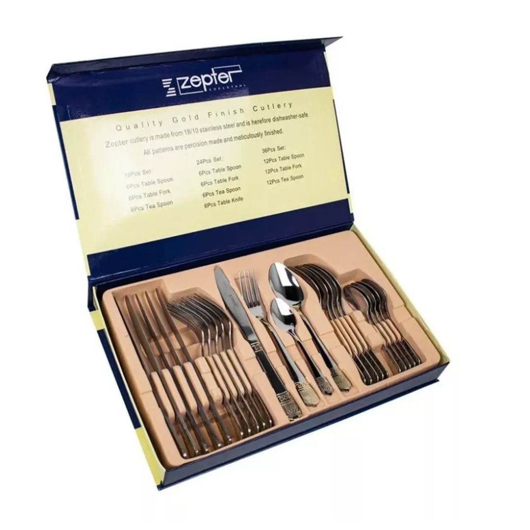 -Marca: Avalon Silverware -Número de piezas: 24 -Material: Acero inoxidable 18/10 (color negro) -Color: plateado dorado-Aptas para el lavavajillas