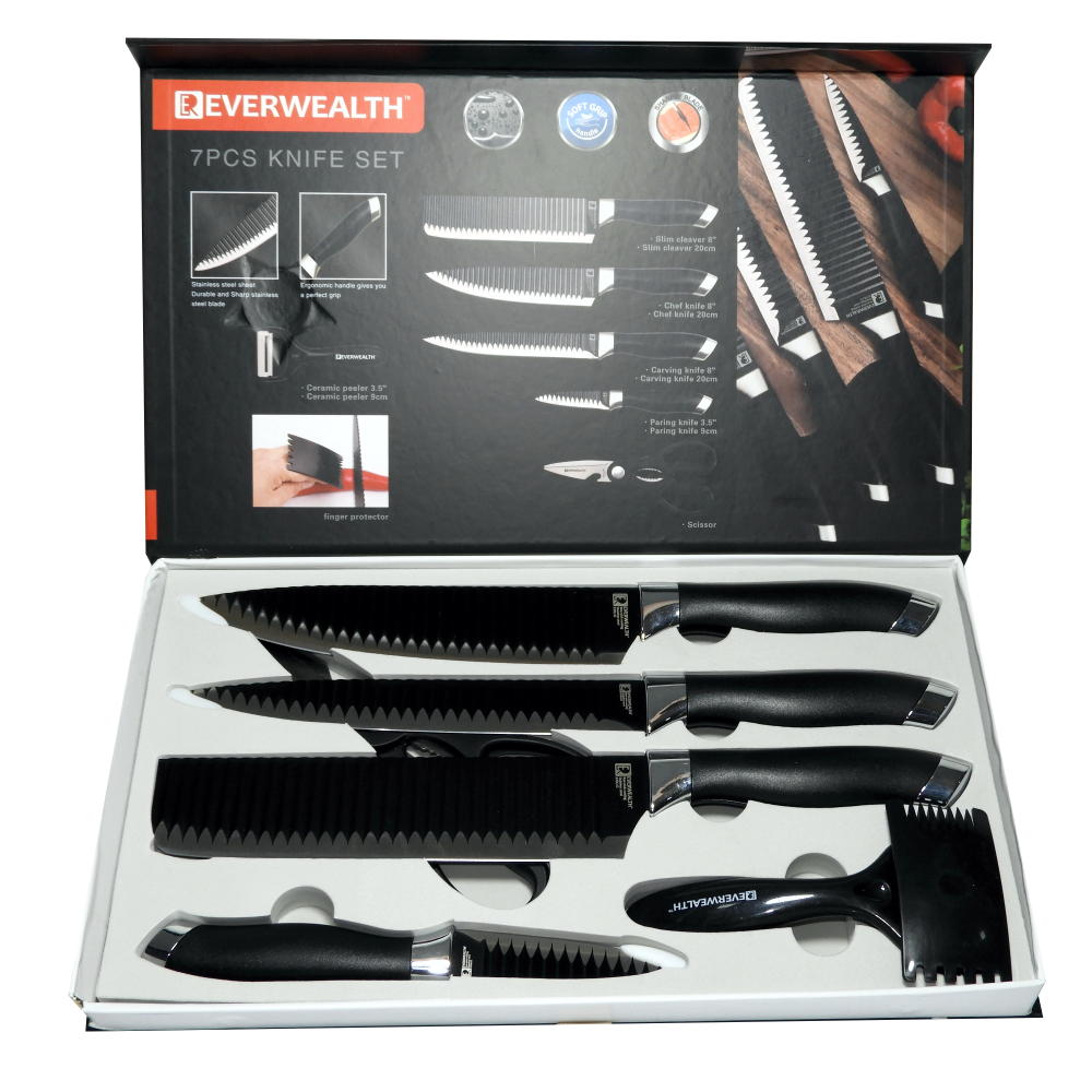 3) Juego de cocina resistente a la oxidación: protección de doble capa con acero inoxidable de alta calidad y revestimiento resistente a la corrosión de titanio. Use una funda de cuchillo separada para evitar que el juego de cocina se oxide.