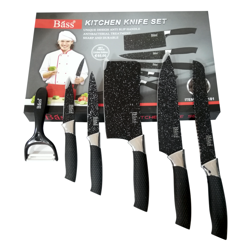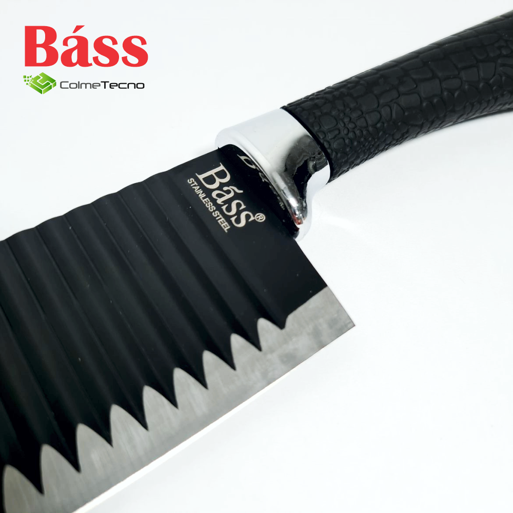 Cada cuchillo viene con las siguientes características: Cuchillo cocinero Negro Gris de 7 pulgadas estable. Ideal para limpiar, cortar carne, pollo, pescado y picar verduras. Cuchillo rebanador, cuchillos de hoja un poco más angosta con filo fuerte, estable. Tiene múltiples usos. Cuchillo panero, hoja larga y fuerte, con filo ondulado. Con dientes que rompen sin esfuerzo la corteza del pan. Cuchillo pequeño y ligero de punta aguda. Se usa para pelar frutas, verduras y tubérculos.diseño es perfecto para partil un trozo de pizza sin despedazar. Pelador: Su diseño rotativo lo hace bastante práctico para mondar frutas y tubérculos