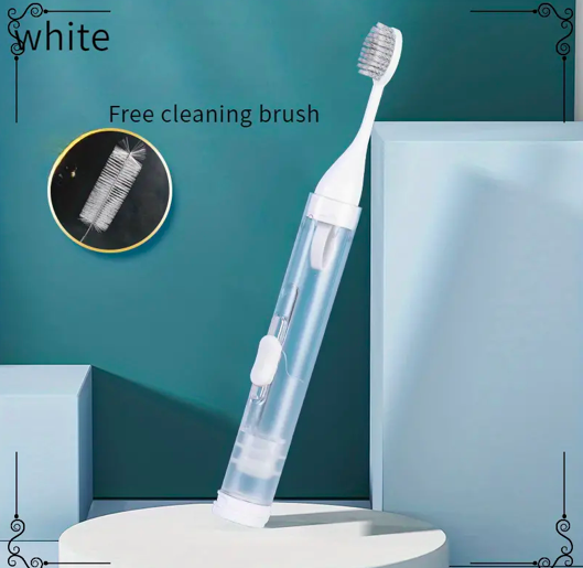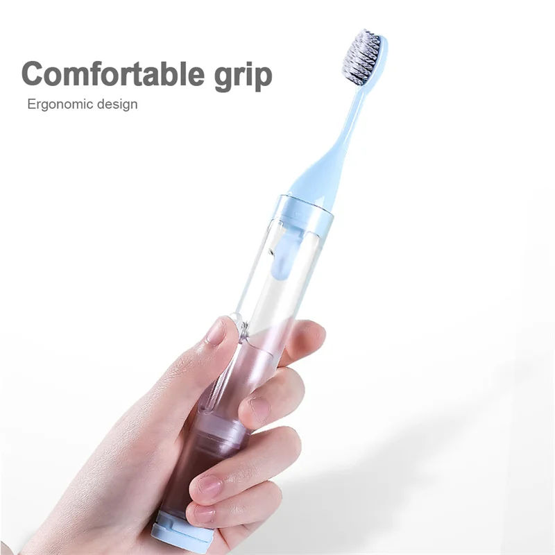 - El tamaño de un bolígrafo, el cepillo de dientes se puede ocultar para su almacenamiento, equipado con una sala de almacenamiento de pasta de dientes, empuje para exprimir la pasta de dientes;