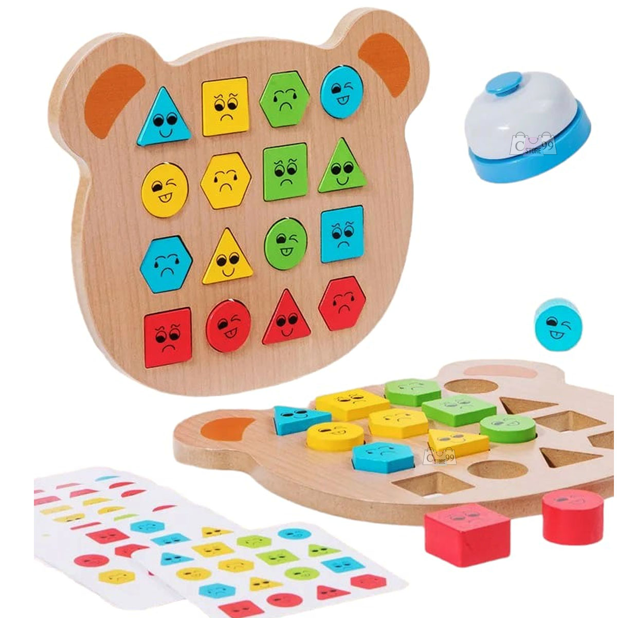 Buen juego social: Este juego de juguetes Viene con 32 bloques de madera con expresión y 15 piezas de tarjetas de cara desafiantes, de tamaño pequeño y portátil y dos tableros