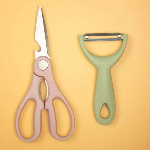 Fácil de limpiar: esta hoja afilada y el mango resistente son muy fáciles de limpiar después de su uso. Después de limpiar estos cuchillos con agua, límpialos inmediatamente con una toalla y sécalos. Las manchas grises en la tabla de cortar son del color original de la paja de trigo, no se ensucia, por favor, no te preocupes @- Multiusos: el juego de cuchillos de cocina de seis piezas es ampliamente utilizado para cortar, rebanar, picar y cortar carne, pescado, queso, pan, verduras y frutas. Las tijeras se pueden utilizar como abridor de botellas y cascanueces. La tabla de cortar se puede utilizar para cortar frutas y verduras. Puede satisfacer la mayoria de sus necesidades de cocina y cocina.