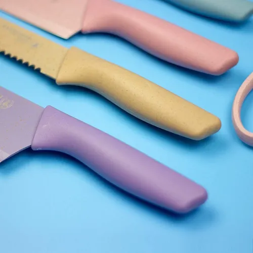 Este Hermoso Juego de cuchillos de cocina de colores: el juego va empacado en Caja, incluye un cuchillo de chef de 8 pulgadas, un cuchillo de Carne de 8 pulgadas, un cuchillo de pan de 8 pulgadas, un cuchillo de pelar de 3.5 pulgadas, un pelador de 6 pulgadas, un par de tijeras y una tabla de cortar de 8 x 13 pulgadas. Es un regalo adecuado para el día de San Valentín, día de la madre, Pascua, Navidad, cumpleaños y negocios.