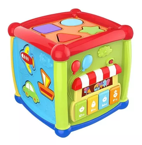 Cubo Didactico con encastre, sonidos y engranes que trabajan la motricidad y estimulan a los mas pequeños de la casa. Ideal para las primeras etapas donde los pequeños aprenden e incorporan conocimientos. Incluye letras y formas.