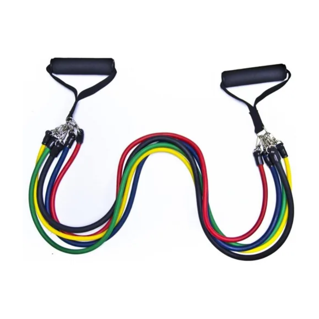 Accesorios de ejercicio completos, juego de cuerdas de tensión de 11 piezas, el cual contiene: * 2 agarres antideslizantes en espuma de alta densidad para las manos * 2 agarres en lona con anclajes metálicos para los pies * 1 agarre en lona con anclaje para la puerta * 1 teratubo amarillo (10 lbs) * 1 teratubo verde (15 lbs) * 1 teratubo rojo (20 lbs) * 1 teratubo azul (25 lbs) * 1 teratubo negro (30 lbs