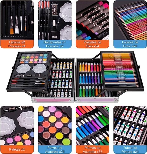 Ayuda a desarrollar la creatividad, imaginación y habilidades de tu hijo con este set de arte. Su diseño en forma de maletín lo hace ideal para llevarlo a todos lados. El set incluye 145 artículos, desde pinturas al óleo y lápices hasta pinceles donde cada objeto tiene su propio lugar. Además, está fabricado con materiales resistentes y ligeros, con asa para el transporte y cierres de seguridad.