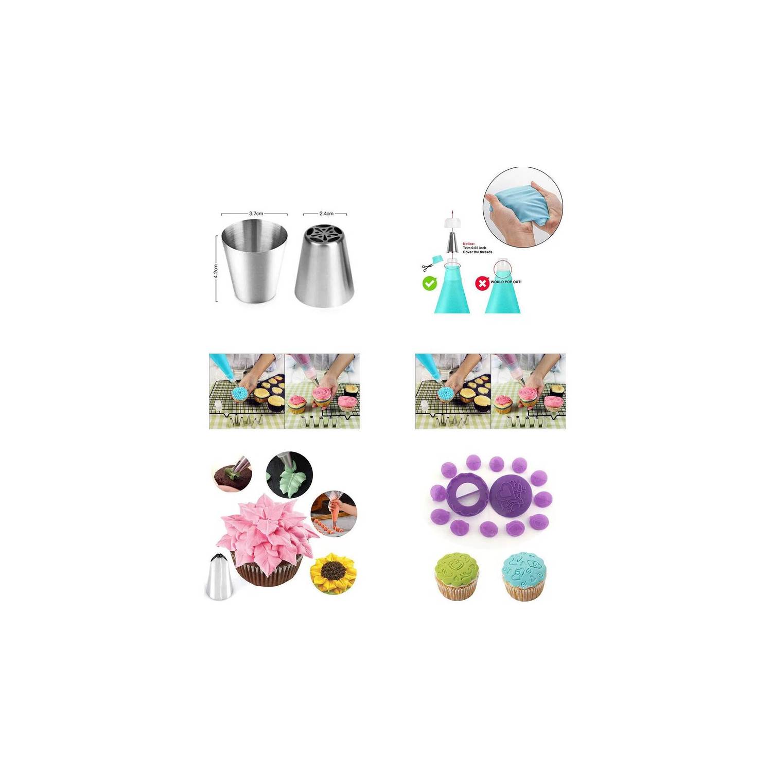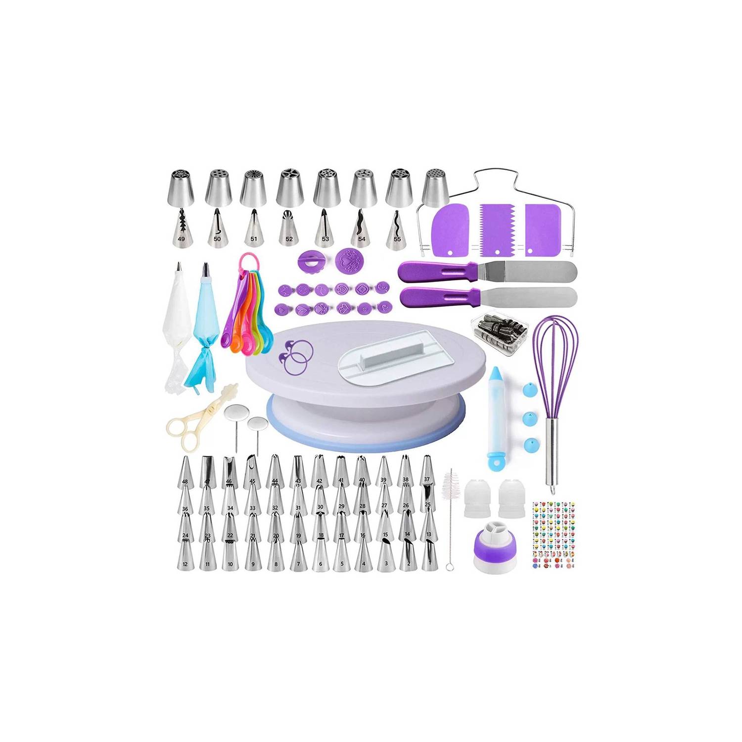 Gran juego de pastelería profesional todo en uno, equipo reutilizable y aprovechable, que proporciona los elementos suficientes para impulsar tu imaginación en el arte de la repostería. Nuestro paquete de materiales de decoración incluye rasquetas, boquillas, una jeringa y cortador de pasteles, uñas de flores, levantador de flores, cepillo recto, bolsas desechables y muchos más artículos imprescindibles que te encantará aprender a perfeccionar y dominar.