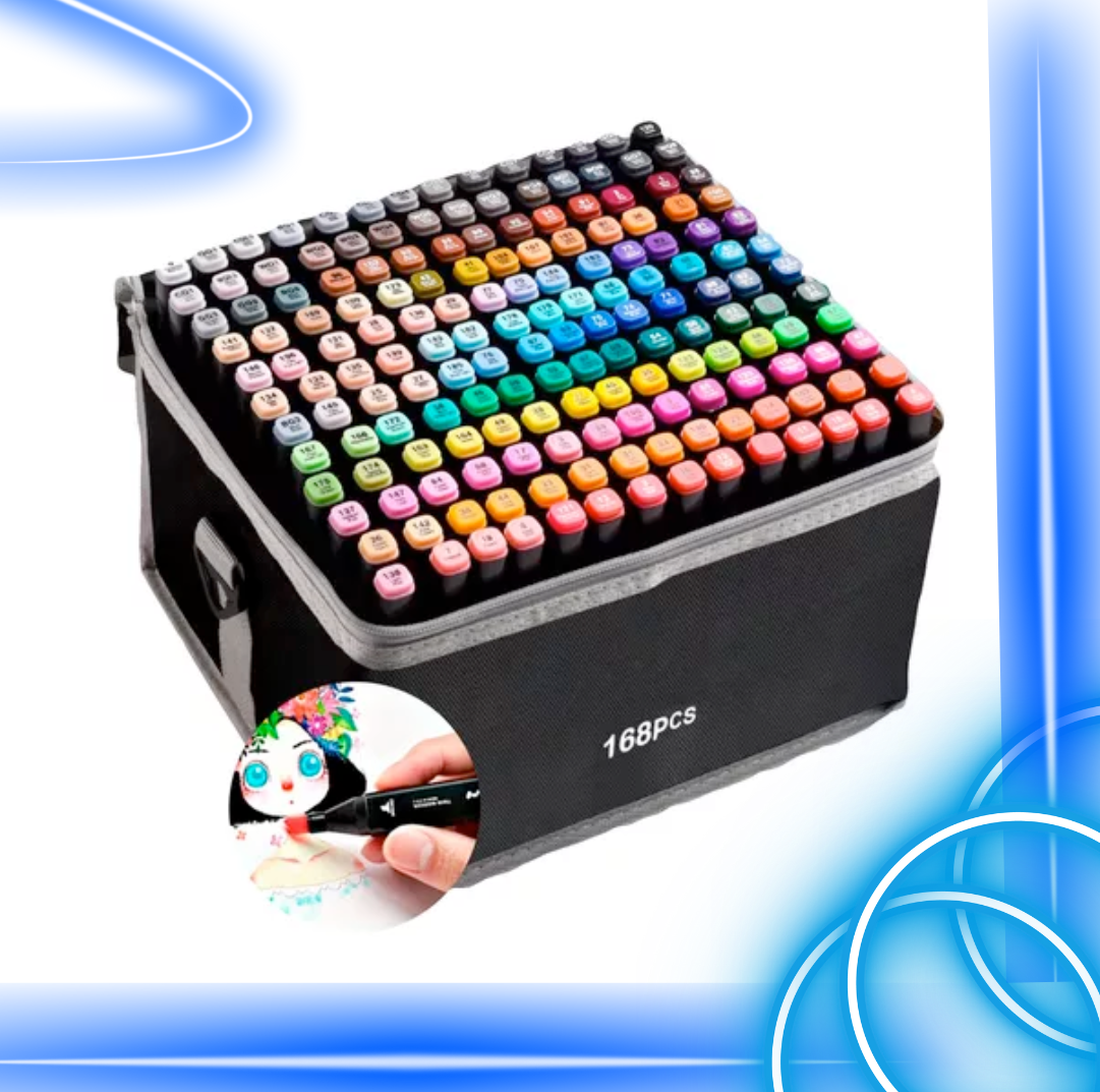 168 colores de rotuladores y una bolsa negra para guardarlos.