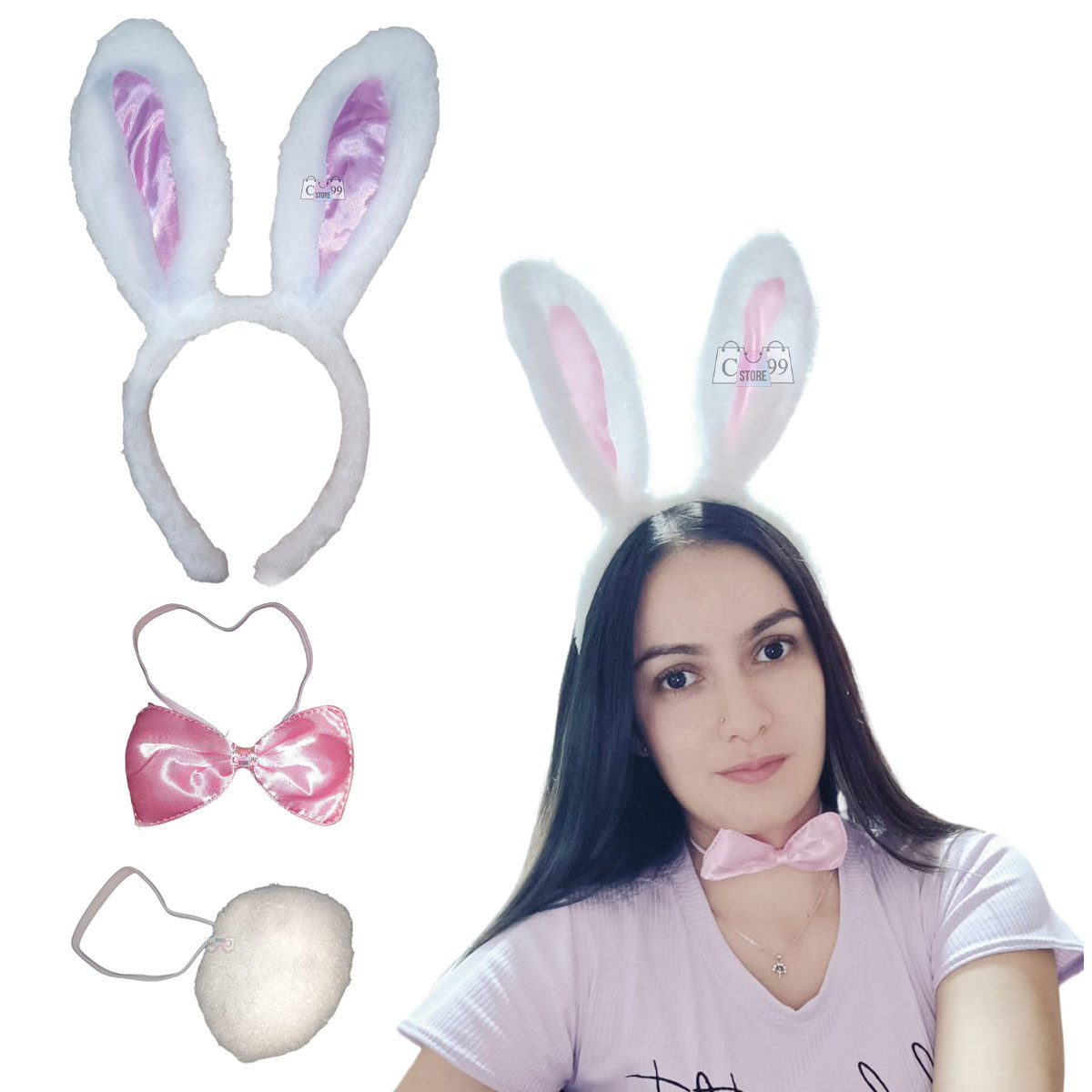 EL paquete incluye: 1 Diadema tipo peluche 1 Moño 1 Cola tipo peluche