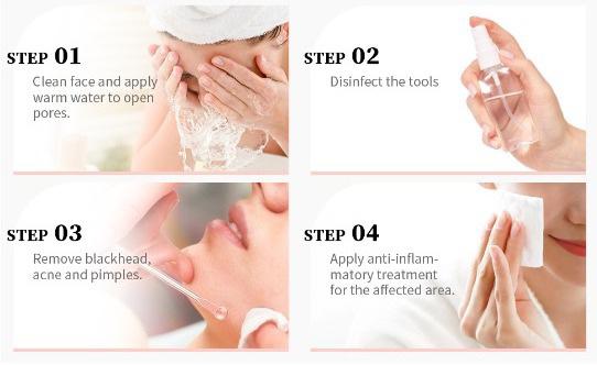 5. Para minimizar el daño a su piel, esta es una manera efectiva de eliminar puntos negros, Simplemente coloque el extremo del bucle sobre la parte superior de la espinilla y presione suavemente, solo debe salir fácilmente.