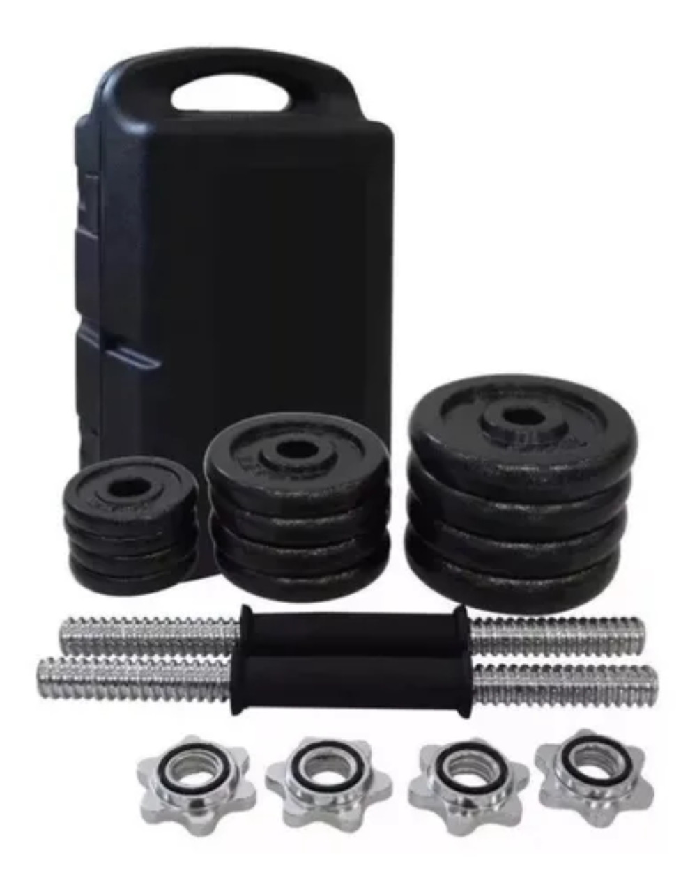 Hechas en acero compacto *cromado* -4 discos de 0.5 kg -4 discos de 1.25 kg -4 discos de 2.5 kg -2 seguros de rosca con goma para mayor seguridad -2 mancuernas con goma ANTIDESLIZANTE en acero -Las pesas pueden utilizarse para barras y mancuernas -Kit incluye pesas importadas 20k + mancuernas de acero+ roscas de ajuste+ maletín