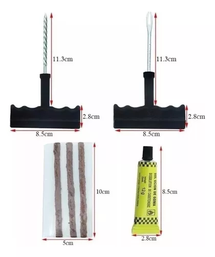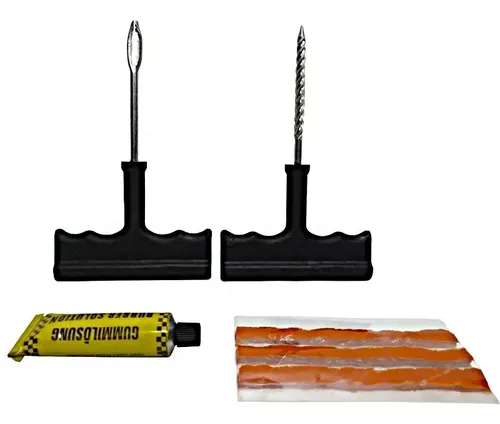 🎇CARACTERÍSTICAS:✨Todo en Uno: Incluye 6 piezas esenciales: herramienta de inserción, cemento de goma y 5 tiras de enchufe. Ideal para reparar neumáticos planos en coches, camiones, carretillas y cortacéspedes.✨Fácil de Usar: El mango en T estilo pistola facilita una reparación rápida y sencilla. Las asas en T permiten insertar los tapones de neumático de manera eficiente.