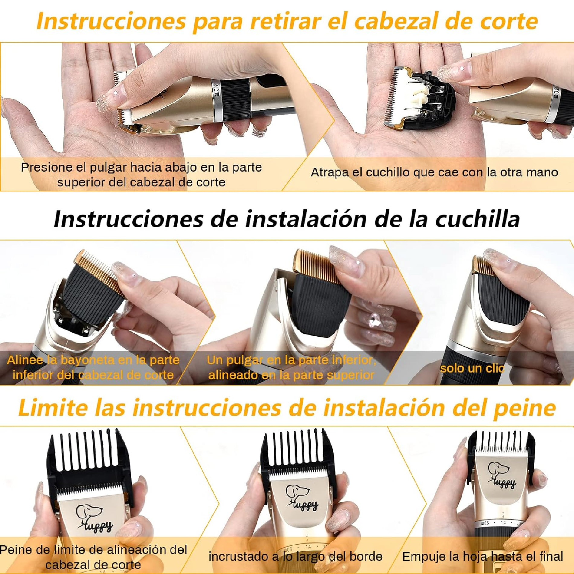 Kit de Peluquería Profesional para Mascotas: El Kit Contiene Todas Las Herramientas Necesarias para la Peluquería de Mascotas: 1 x Trimmer, 4 x Combo de Límite (3-6-9-12mm), 1 x Cepillo de Limpieza, 1 x Cable de Carga USB ( debería Usar su Propio Cargador de Pared), 1 x Tijeras Inoxidables, 1 x Peine de Acero Inoxidable, 1 x Cortauñas, 1 x Lima de Uñas, es Perfecto para Sus Adorables Mascotas.
