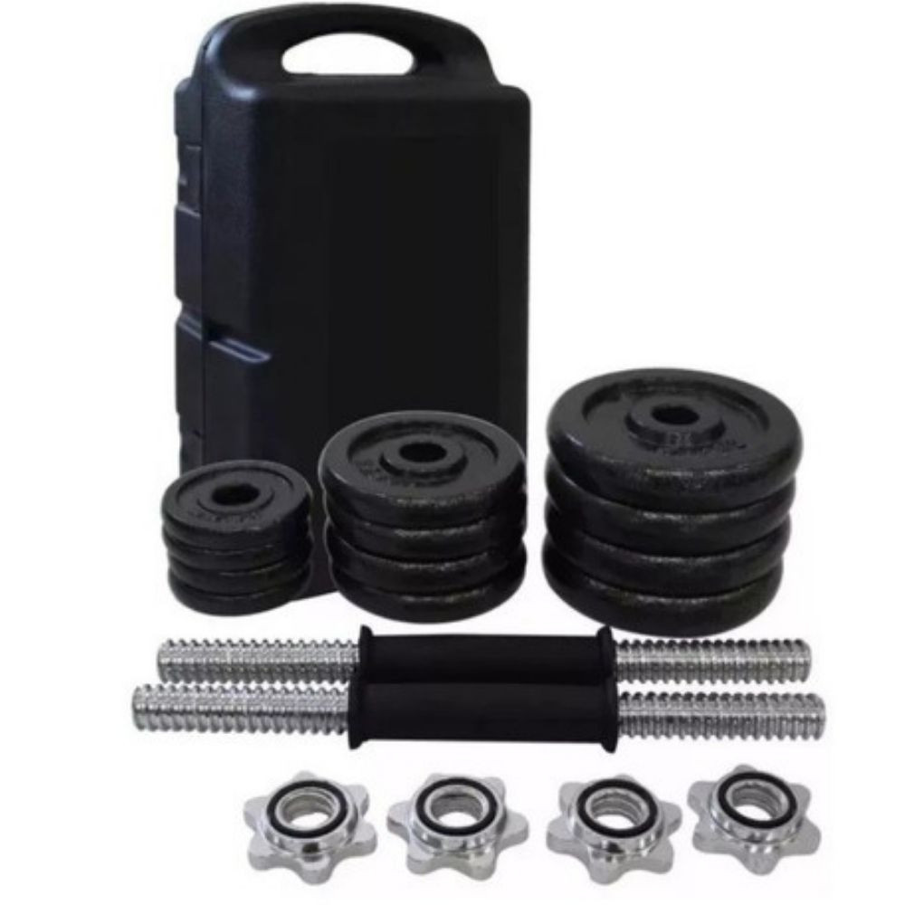 Es un organizador tipo maletín, para fácil desplazamiento y manipulación 2 barras para mancuernas en acero cromado con dos seguros roscados cada una. El maletín no tiene garantía Juego de discos cromadas