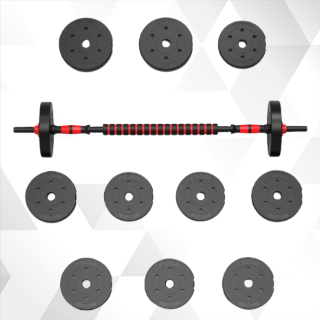 Este set de mancuernas de 20 KG incluye una barra ergonómica y cierres en forma de estrella para un ejercicio más seguro y efectivo.