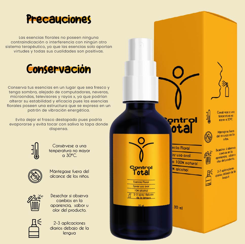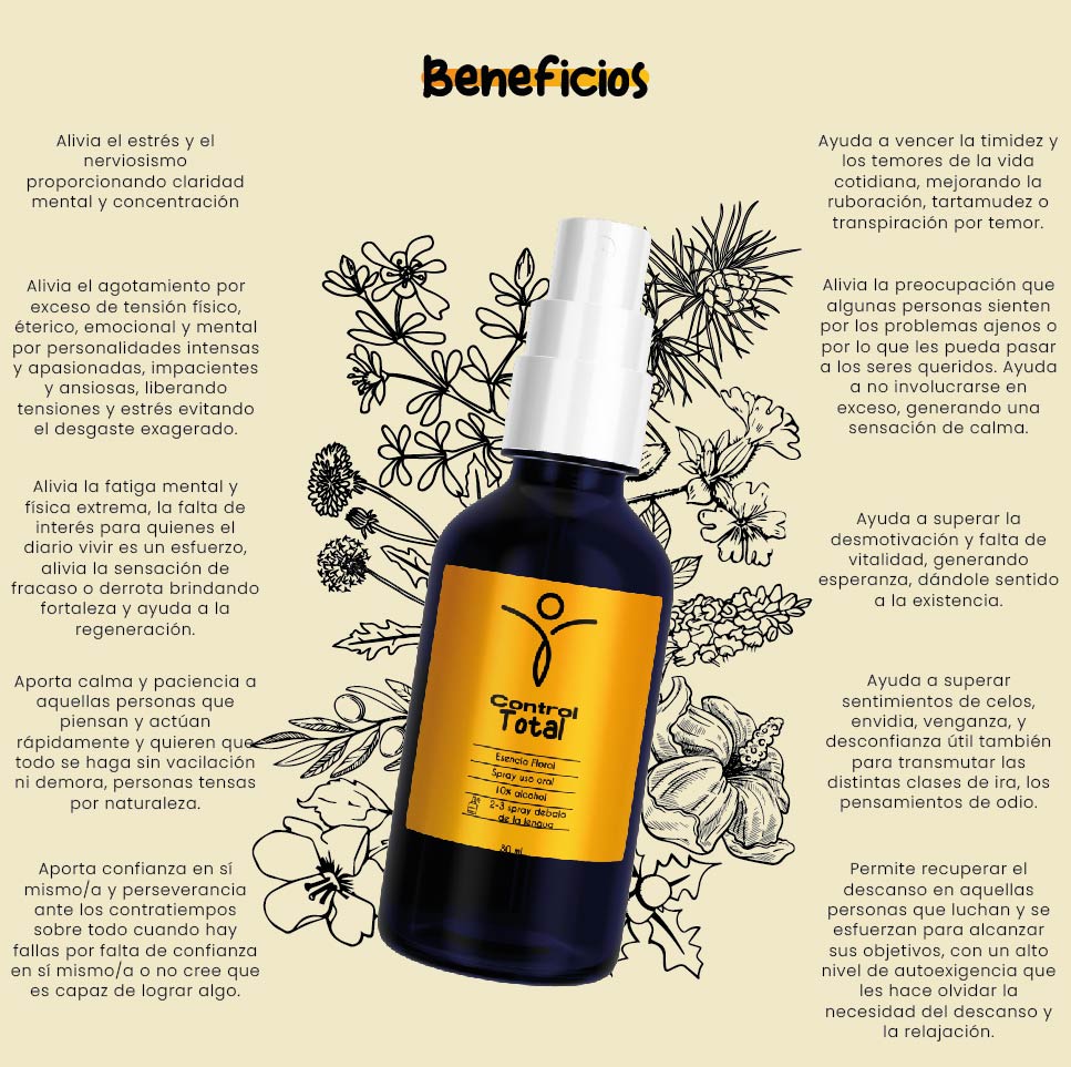 Control total es una mezcla de esencias florales que te permiten encontrar el control de tus emociones como el estrés, la ansiedad, irritabilidad entre otras para transformarlo en calma, enfoque, autoconfianza y fuerza.