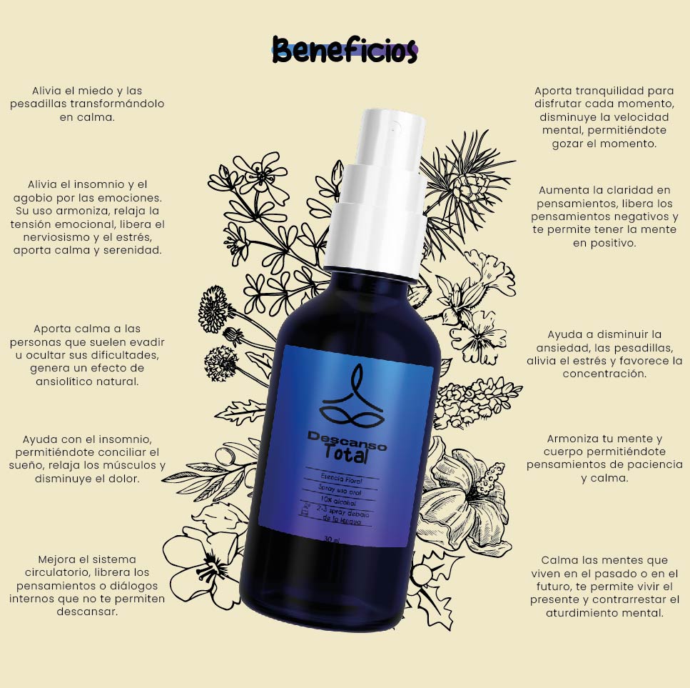 Descanso Total está diseñada para reducir el tiempo en que conciliar el sueño, reduce la irritabilidad, pesadillas, insomnio y sonambulismo. Te permite callar el exceso de pensamientos que te impiden descansar bien y soltar la tensión emocional. Sentirás que tú descanso aumenta, te cuesta menos conciliar el sueño y despiertas con más energía.
