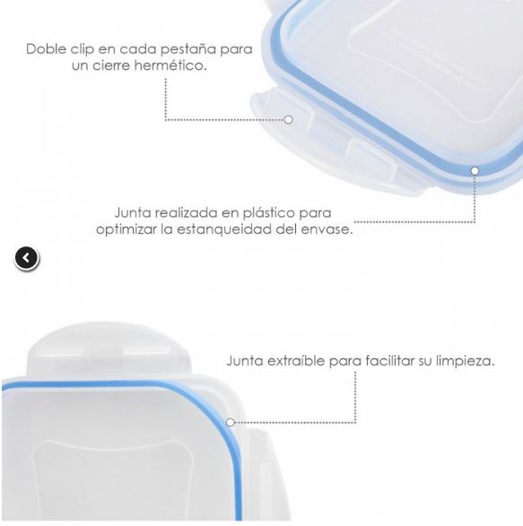 Las tapas cuentan con un sistema de cierre de tipo clip con 4 ubicados a cada lateral, lo que facilita su manejo y a su vez da seguridad de que no pasara nada extraño mientras te transportas, además, que se adhieren al recipiente aislando los alimentos de gérmenes y olores externos y favoreciendo su perfecta conservación. Son aptos para lavavajillas, microondas (siempre que no esté cerrado). Además, se pueden almacenar unos dentro de otros para ayudar a ganar espacio y tener todo bien organizado en nuestra cocina.