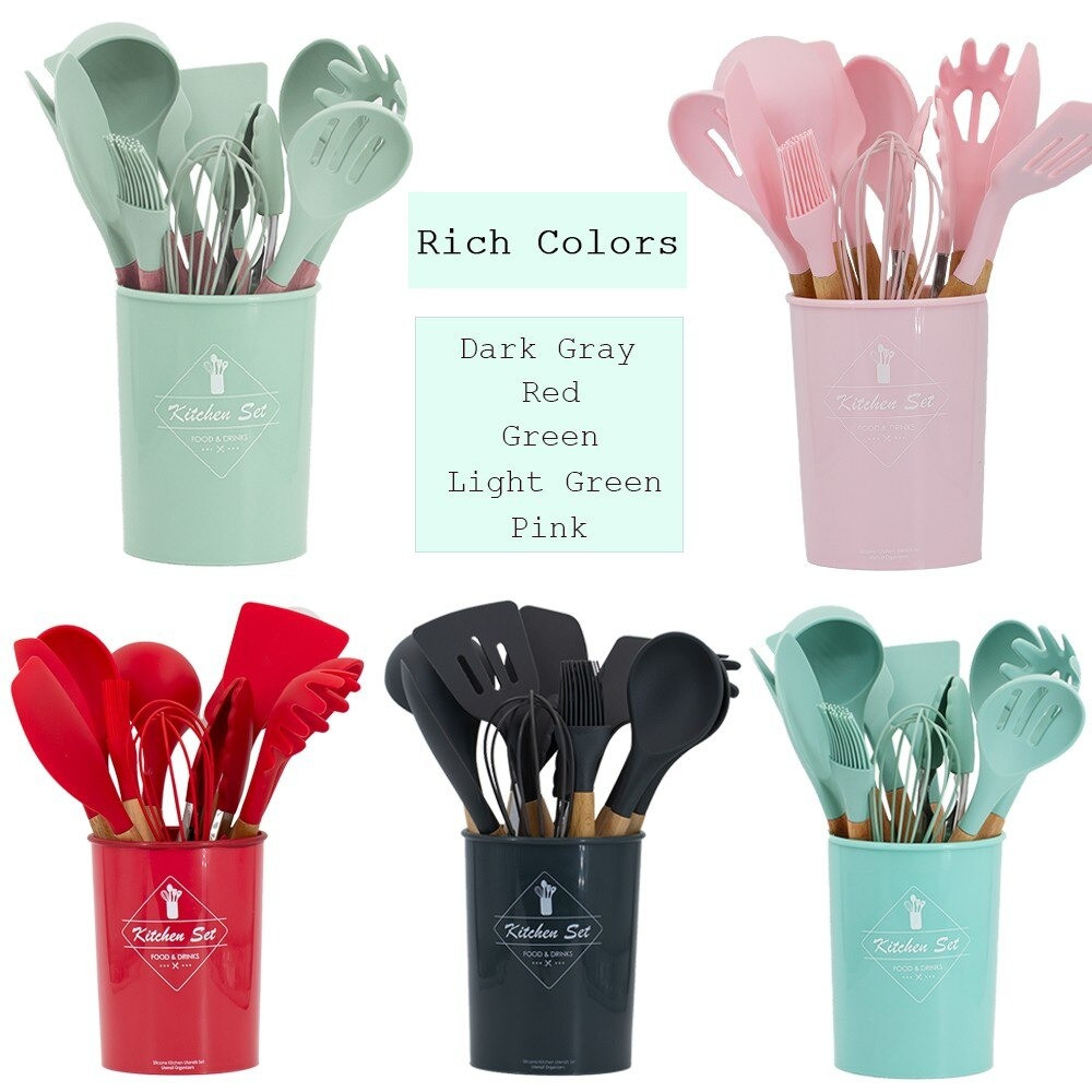 CARACTERÍSTICAS @@• CALIDAD: Los utensilios de cocina de silicona son 100% de grado FDA y no contienen BPA. @• Estas herramientas de cocción resistentes al calor se pueden usar hasta 480 °F y son antiadherentes. @• Resistente a manchas y olores. Las herramientas no se decoloran, deforman, funden ni se astillan @• RESISTENCIA AL CALOR: antiadherente y resistente al calor hasta 440F, nuestras prácticas espátulas son imprescindibles para chefs aficionados y profesionales. @• FÁCIL DE LIMPIAR: después de preparar una deliciosa comida casera, ¿quién tiene la energía para limpiar un fregadero lleno de platos? @• ¡Con nuestros utensilios de cocina premium, no tiene que hacerlo! @• Son aptos para lavavajillas y resisten las manchas y el olor, lo que hace que la limpieza después de las comidas sea más fácil que nunca. @• DISEÑO MODERNO: este atractivo conjunto incluye todos sus utensilios de cocina esenciales: un volteador, una cuchara ranurada, un cucharón, una cuchara, una espátula, una espátula, una espátula y un cepillo para rociar.