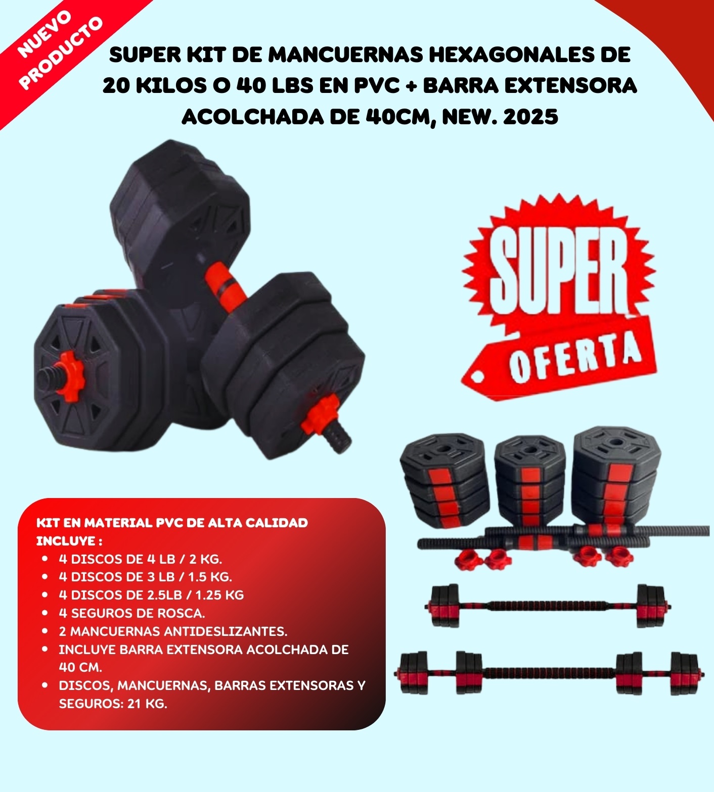 Super Kit De Mancuernas De 20 Kilos O 40 Lbs En Pvc Hexagonales + Barra Extensora Acolchada De 40cm, New.