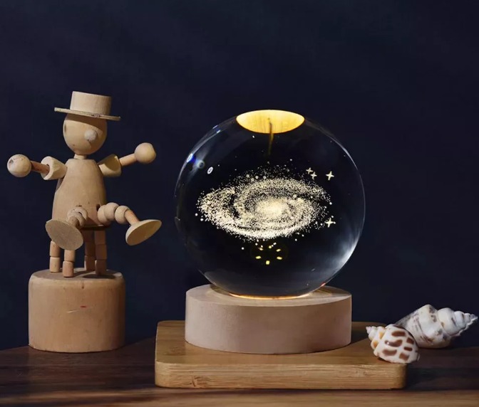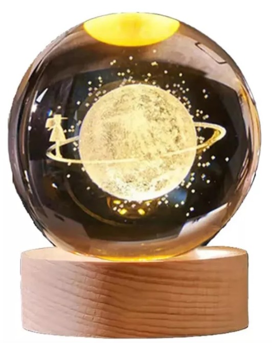 Es una lámpara que tiene una esfera de cristal de 6 cm de diámetro que se coloca en una base de madera de 6 cm de diámetro por 2 cm de alto, en medio de la base tiene un hueco donde 6 luces LED con tonalidad cálida iluminan a la esfera. La base tiene un cable el cual se conecta mediante entrada USB.