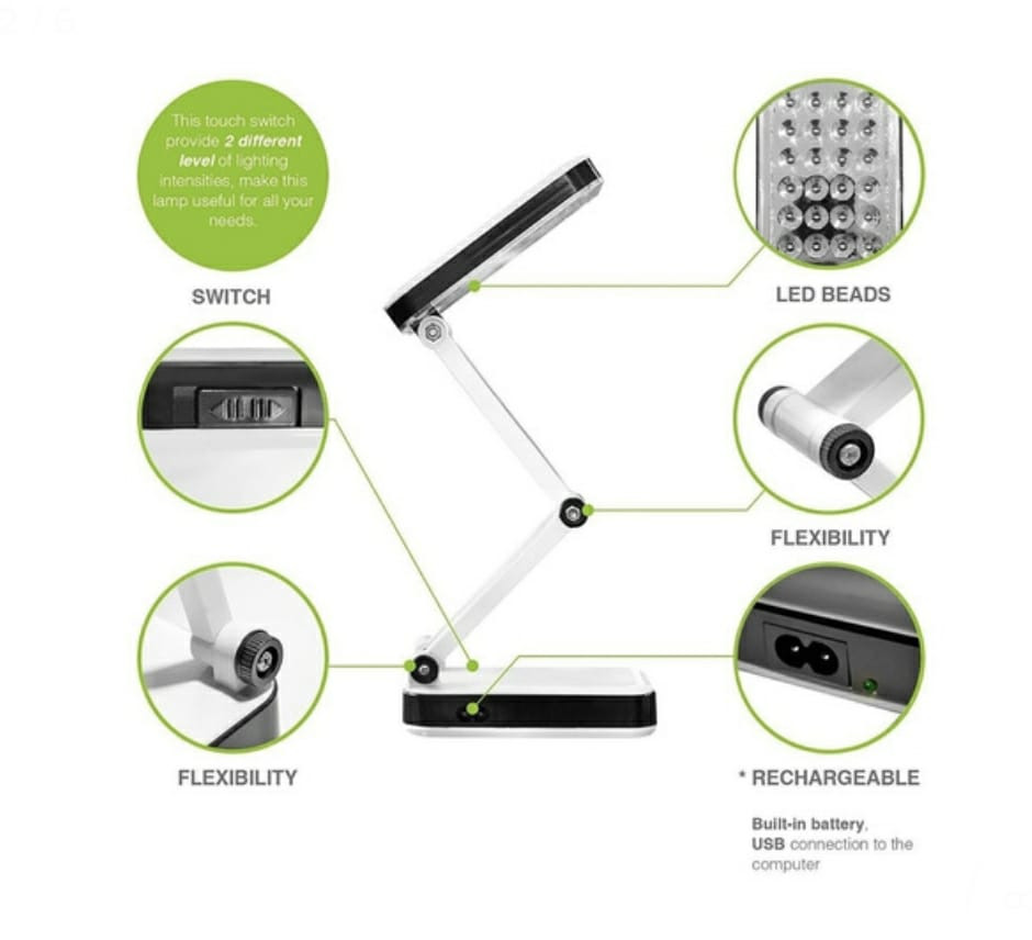 Con esta lampara podrás solucionar el problema de poca luz mientras estas realizando alguna actividad. Cuenta con una base plegable que puedes acomodar la altura de acuerdo a lo que necesites, aparte su diseño pequeña y plegable te permite guardarla fácilmente y llevarla a cualquier lugar.