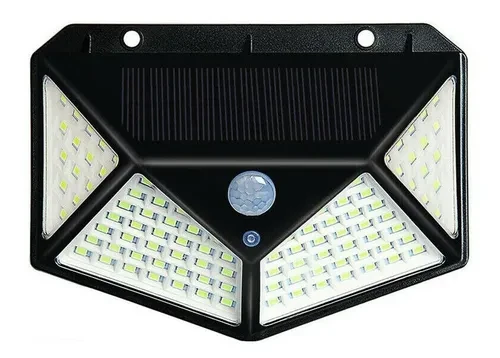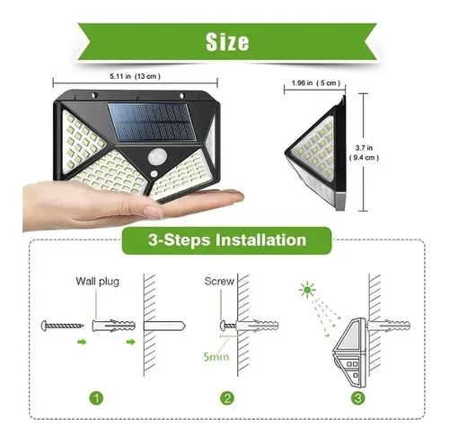 7. Detecta el movimiento en un área de 120 grados. @8. Una vez detectado el movimiento, tendrá 270 grados de iluminación. Esto es debido a que en el lateral, se encuentran parte de los 100 LED de la lámpara solar. Una buena área amplia para despedirte de la oscuridad. @9. Antes del primer uso, se recomienda cargar la lámpara solar durante 24 horas al sol. Para mayor eficacia, la luz solar a incidir de manera directa en los paneles solares, evitando obstáculos. @10. Se recomienda que el panel solar reciba directamente la luz del sol durante al menos 6 horas diariamente.@11. Tres maneras de activar la Luz: # 1 Se activa la luz al detectar movimiento, a los 10 o 15 segundos se apaga, # 2 la luz estará siempre encendida, pero cuando detecta se vuelve más intensa y # 3 una tenue luz está siempre encendida. @12. Ideal para clima cálido. @@Nombre del artículo: Luz Solar LED para exteriores @Color Luz: blanca @Cantidad de LED: 100 Uds SMD2835 @IP: IP65 @Modo: detección de movimiento humano + control de luz @Panel Solar: 0,55 W 17% de eficiencia @Batería de iones de litio: 3,7 V / 800 mAh @Tamaño del Panel Solar: 8 cm * 4,5 cm @Tamaño: 12,9 cm * 9,39 cm * 4,97 cm @Tiempo de carga: 6-8 horas @Tiempo de uso: => 6 -8 horas