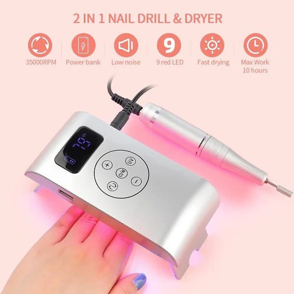 2 en 1 taladro de uñas Uv y secador de uñas y banco del poder, no solo una pulidora, sino también una MINI lámpara de uñas y una POWER BANK.USB puede cargar el teléfono.