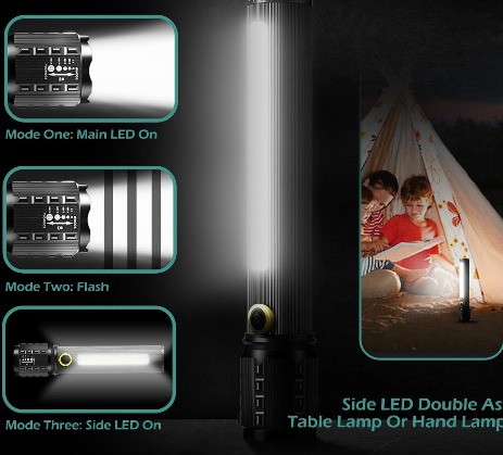 4. 3 modos de linternas: modo uno: iluminación de luz principal; modo dos: luz principal intermitente; modo 3: iluminación lateral.