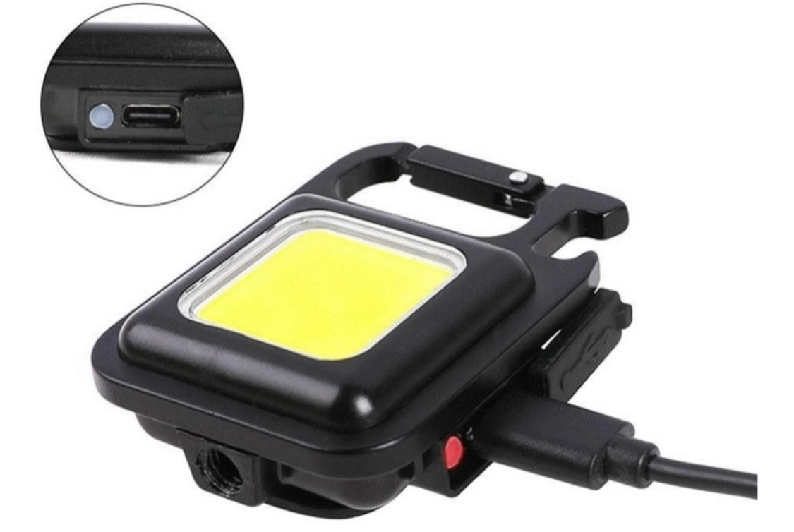 La luz del llavero es mini y portátil para funcionar como luz de emergencia y luz de trabajo, fuente de luz COB, cuatro modos, carga rápida. Tiene un imán fuerte, diseño de bloqueo de gancho, soporte plegable, abrebotellas y orificio de soporte, uso multifuncional.