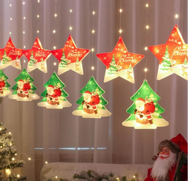 Instalación tipo “cortina figuras navideñas”. Equipada con 10 figuras iluminadas por 10 LED interiores cada una, es el complemento decorativo ideal para esta navidad. Gracias a su brillo combinado de LED fijos e intermitentes con diferentes colores proporcionará a su hogar luz cálida y acogedora. Perfecta para decoración de interiores y exteriores como tejados, puertas, ventanas o cualquier lugar que se le ocurra.