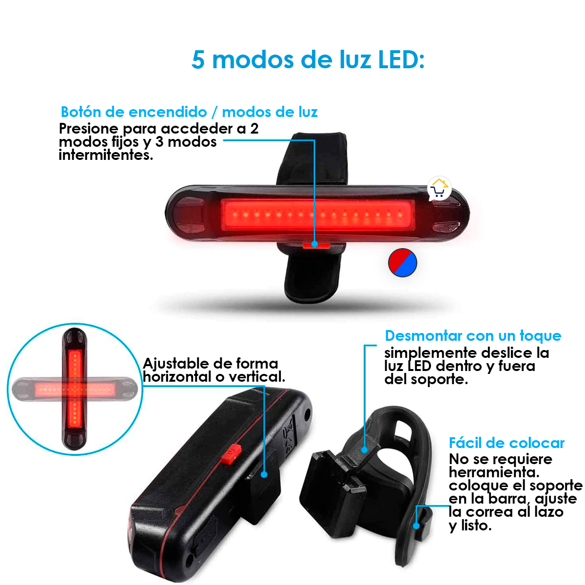 - La luz de bicicleta de noche está diseñada con 5 modos de iluminación en color rojo y azul: luz fija roja, luz fija azul, flash lento, intermitente, flash de dos colores.