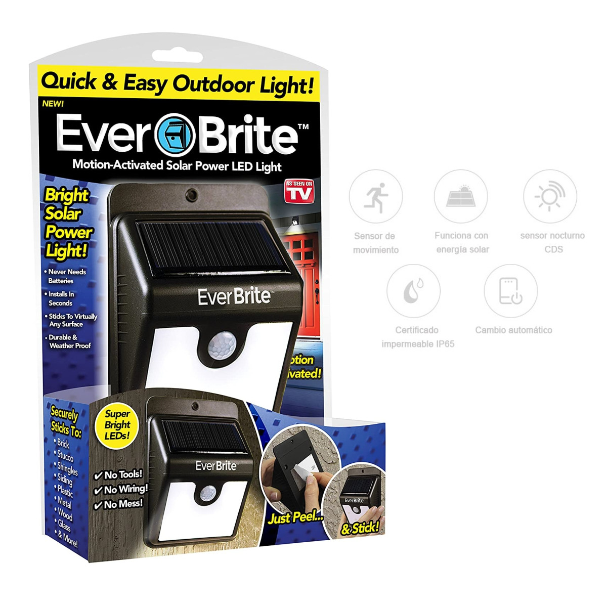 Ever Brite es una luz LED para exteriores activada por movimiento que es duradera y resistente a la intemperie. Esta luz súper brillante alimentada por energía solar nunca necesita baterías y cuenta con un montaje de pelar y pegar sin necesidad de herramientas ni cableado. Ever Brite cuenta con encendido/apagado automático y un sensor de movimiento que aumenta el brillo cuando se detecta movimiento.