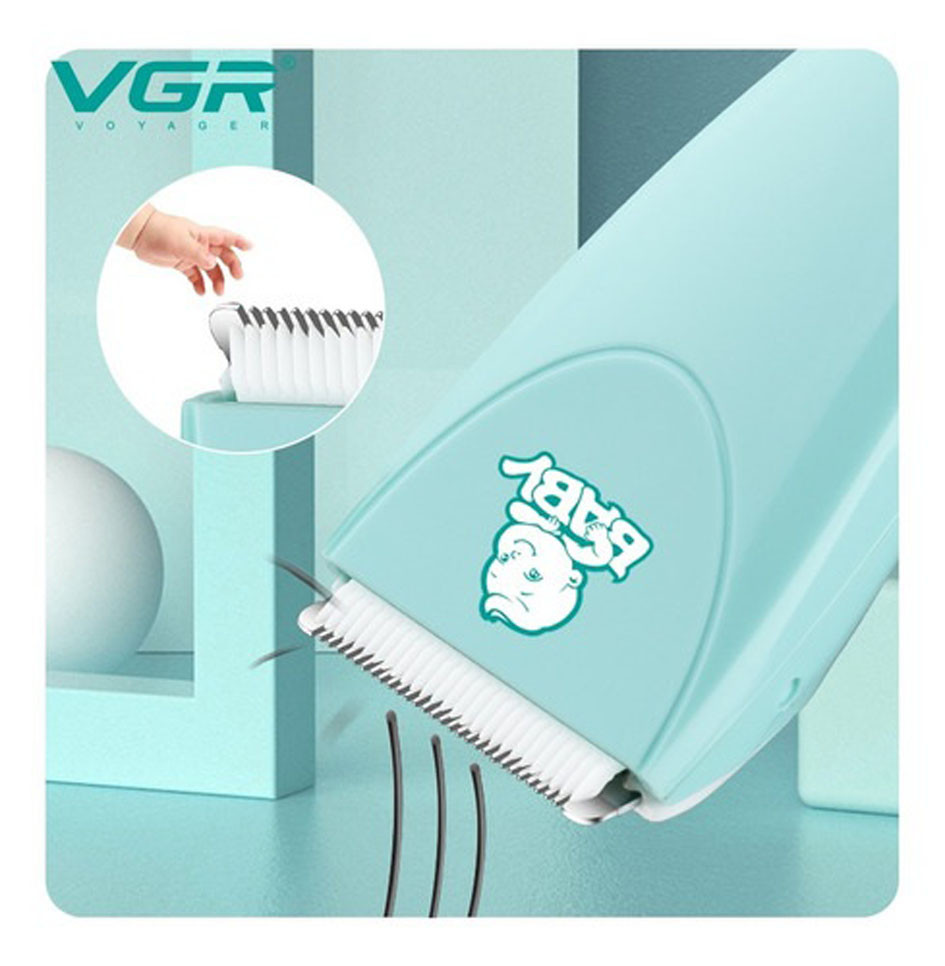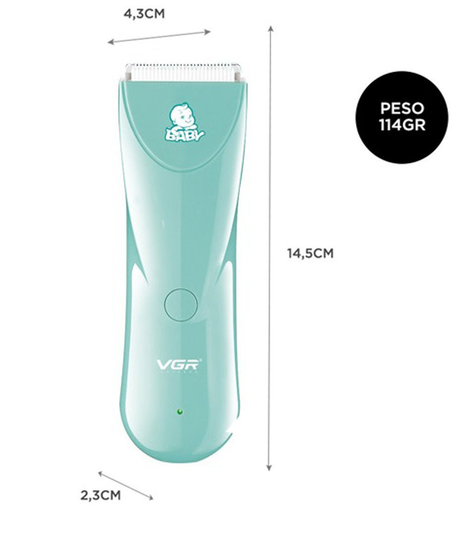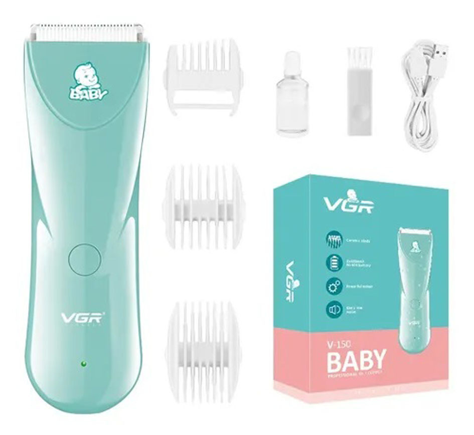 Máquina para cortar cabello VGR Baby V-150 de color verde marino es una máquina inalámbrica ideal para cortar el cabello de niños y bebes. Su cabezal de chuchillas de cerámica profesional es especial para el pelo suave de niños y bebes, evitando cortes o jalones y cuidando el bienestar de su pelo.