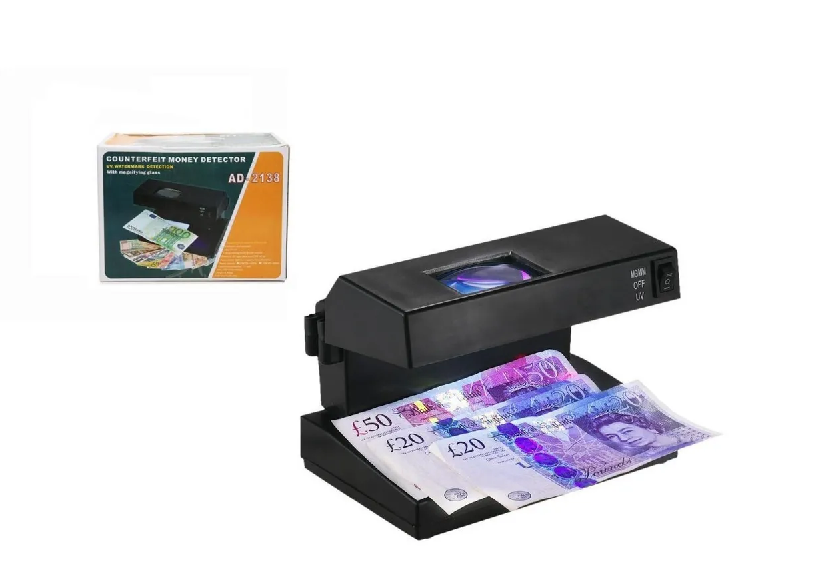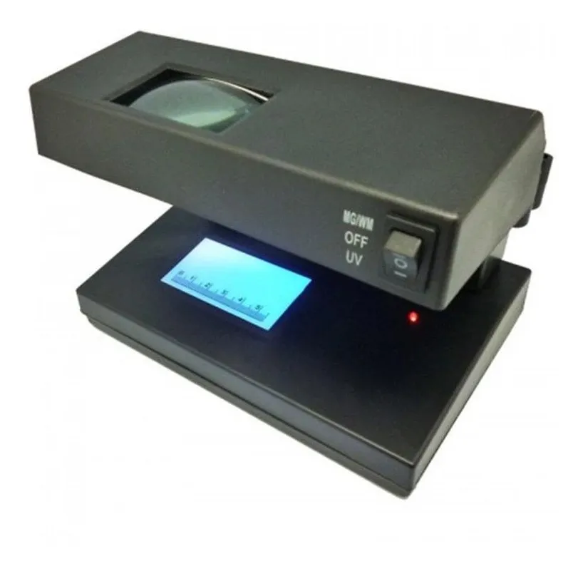 Funciona conectado al toma corriente interruptor de encendido / apagado encendido electrónico diseño compacto controla la autenticidad de billetes. Detecta las marcas de tipo ultravioleta.